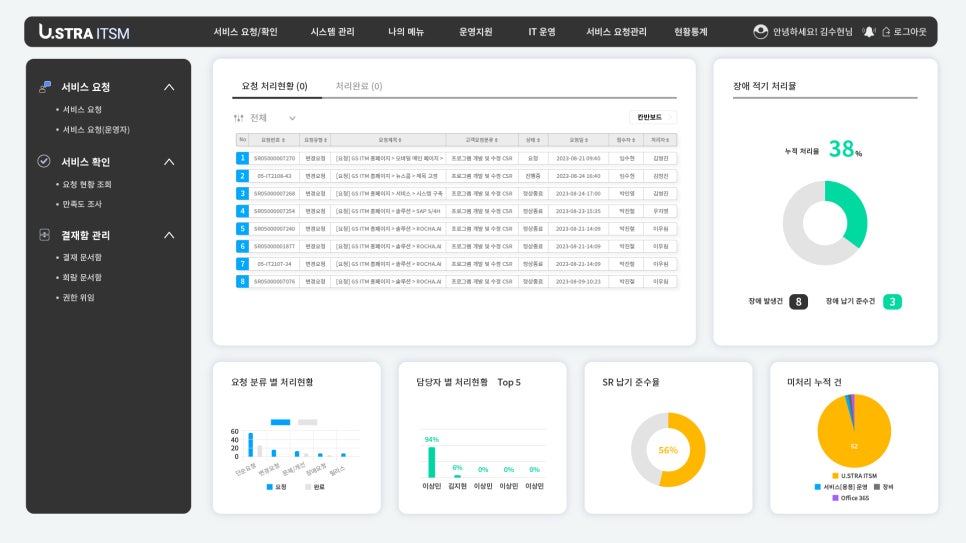 서비스 요청 및 확인 처리 현황을 조회할 수 있는 기능입니다. 이 기능을 통해 각 담당자는 해야 할 일을 따로 정리하지 않아도 쉽게 확인할 수 있어, 업무 능률이 크게 향상되었습니다.